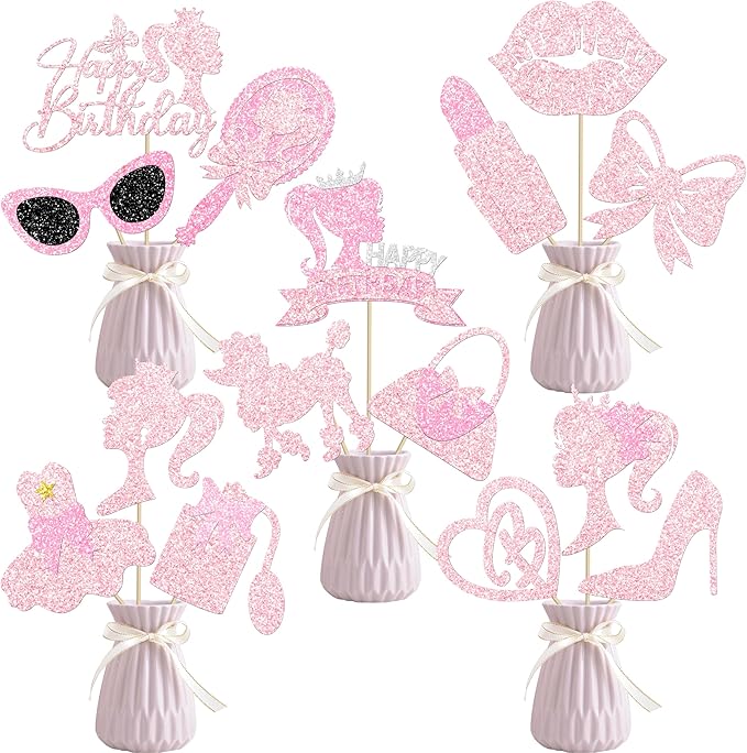 • 【Pink birthday party decorations for girls】The pink girl party table toppers are designed in 16 different designs, including lipstick, high ponytail girls, dresses, handbags, bows, sunglasses and more. Special design will add more fun to pink birthday party.