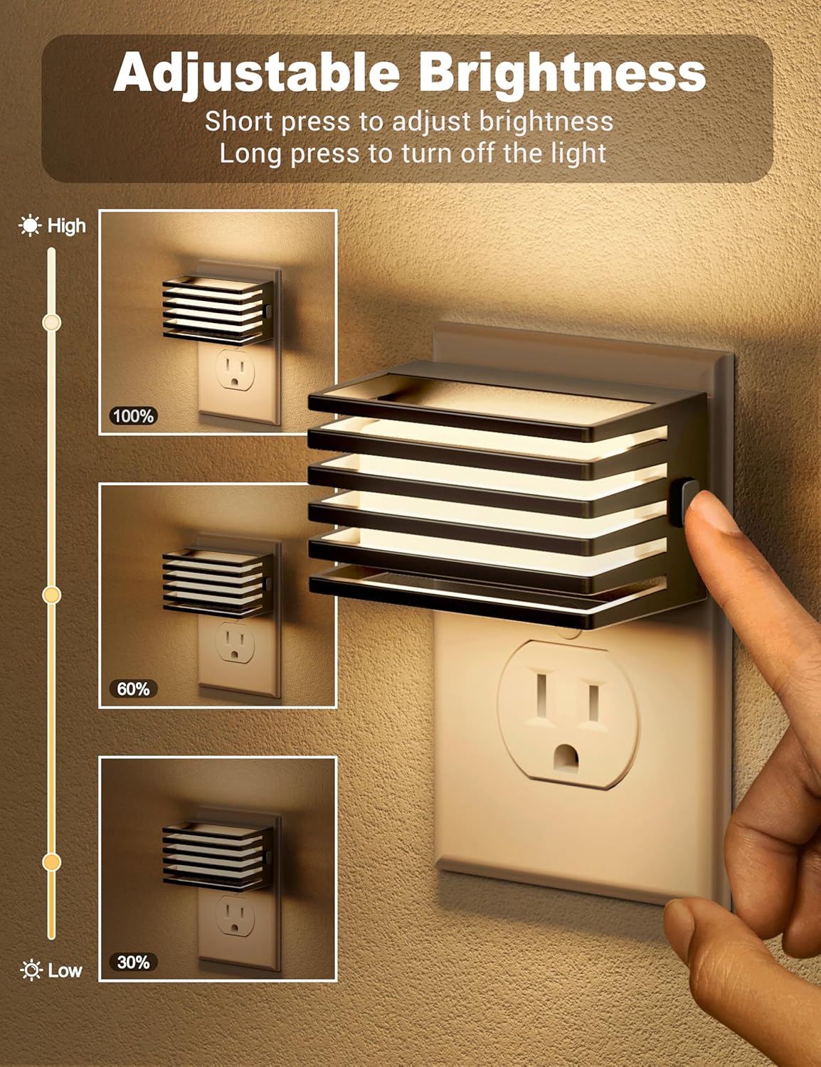 Auto On/Off: Smart light sensor automatically powers the night light on or off based on ambient light, saving energy and adding convenience.