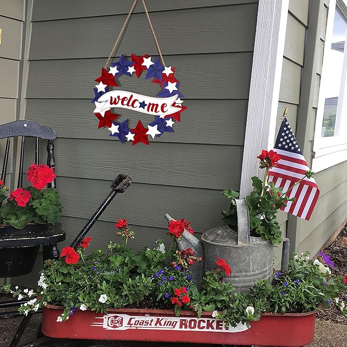 • Feature: The welcome wreath sign, designed with surrounded red white blue stars, boasts vibrant, beauty printing
