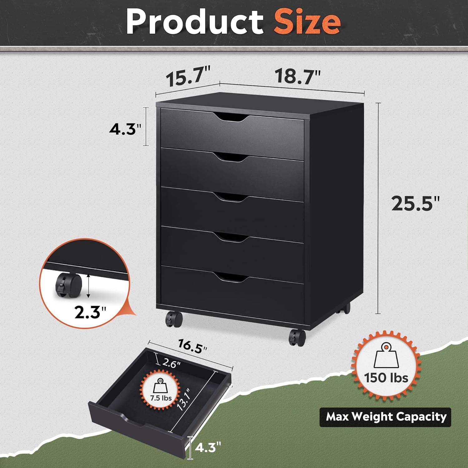Spacious Storage: Measuring 18.7″ W x 15.7″ D x 25.5″ H, the dresser features five drawers, each supporting up to 18 lbs, providing ample space to organize clothes and accessories efficiently.