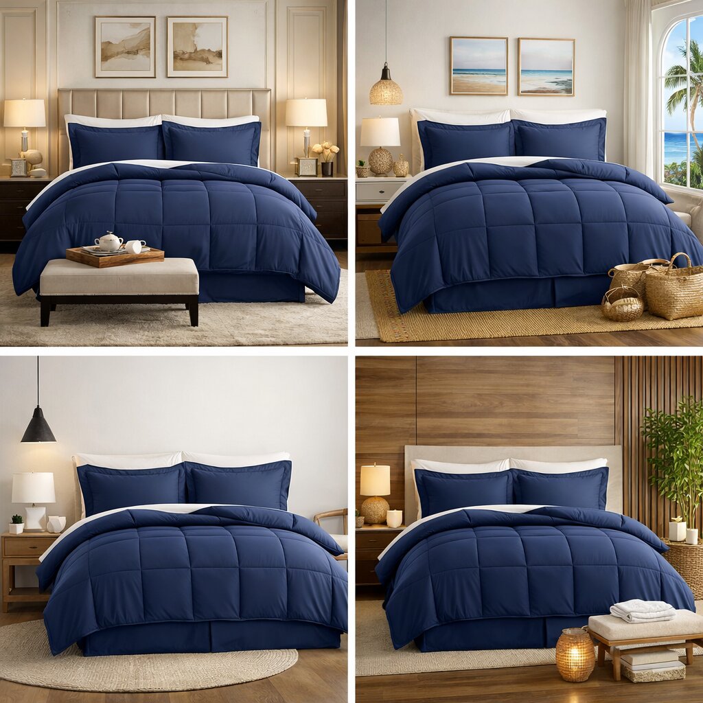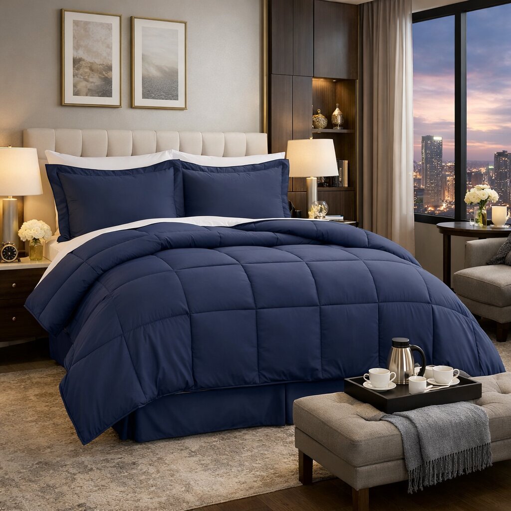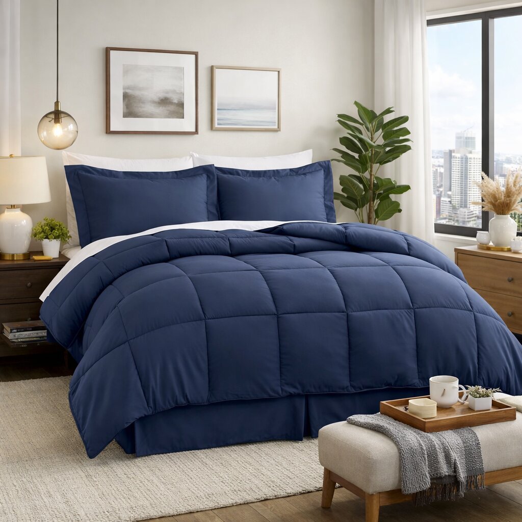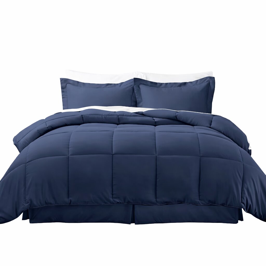 This 8-piece navy queen comforter set is crafted from ultra-soft double-brushed microfiber for exceptional comfort and breathability. The durable, wrinkle-resistant material is designed to last longer than traditional cotton and works for all seasons. Perfect for creating a cozy and stylish bedroom, this set makes mornings harder to leave your bed.