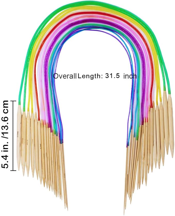 • Bamboo circular knitting needles come with 18 different sizes with diameter permanently marked on needles for ease of selection, the sizes from 2 mm to 10 mm. Overall length of circular knitting needle measures appr. 31.5in.