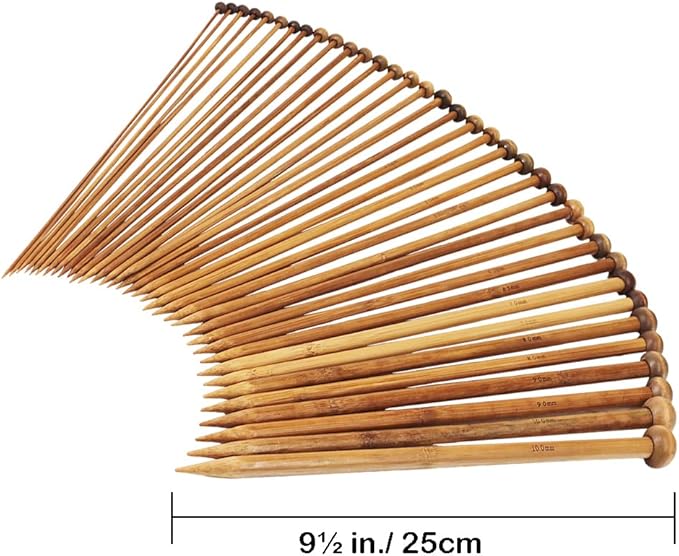 • Single pointed bamboo knitting needles in 18 sizes, which are permanently engraved onto the handles. The sizes from 2 mm to 10 mm. Length of knitting needles measure appr. 9in.Each set includes all the most popular US sizes and then some!There is no static reactions on it makes you weaving happily.