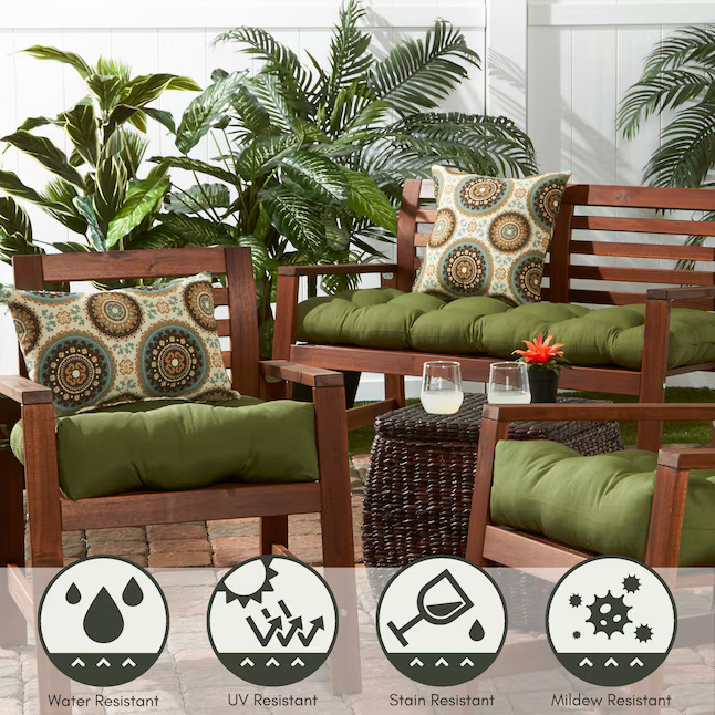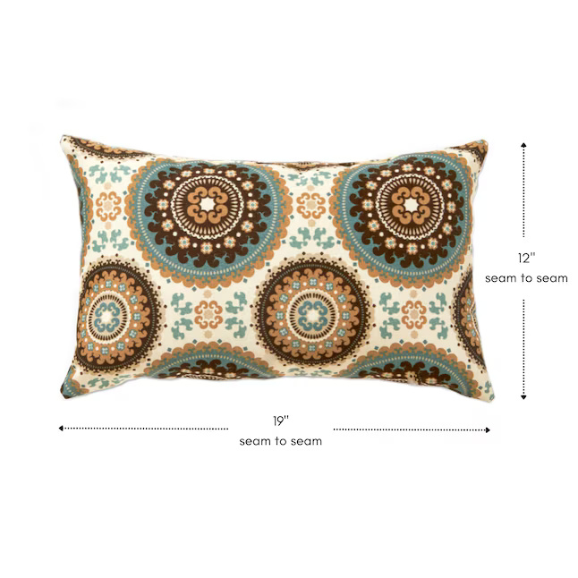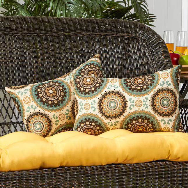 Enhance your outdoor seating with this set of two $19 \times 12$ inch rectangular accent pillows, designed to bring vibrant color and style to any patio or deck. Each pillow is generously overstuffed with a plush, durable polyester fill crafted from 100% recycled post-consumer plastic for an eco-friendly touch. The exterior is constructed from heavy-duty outdoor fabric that resists water, fading, stains, and mildew, ensuring long-lasting performance.