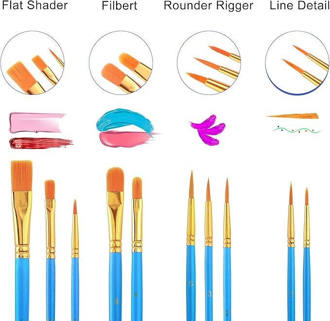 • 【PAINT BRUSHES】: 10 sizes versatile paintbrushes set with a variety of shapes making color grading easier, perfect for artists, students, teens, kids and painters of all levels.