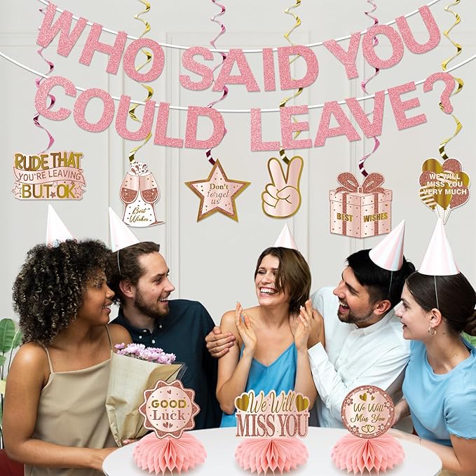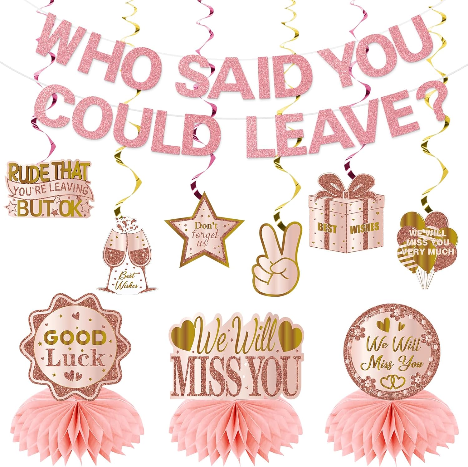 • Uiorgui Farewell Party Decorations Includes: who said you could leave banner x2, rude that you are leaving but ok going away themed hanging swirls x6, good luck we will miss you table decorations honeycomb centerpieces x3