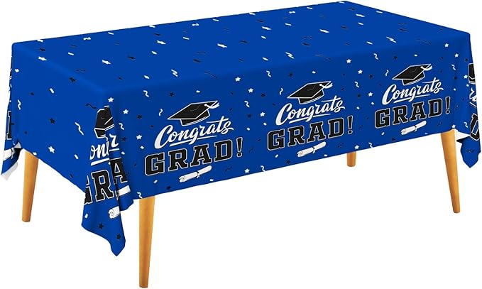 • Class Blue background, repeating pattern of mortarboards and “CONGRATS GRAD” , this graduation party tablecover reflect a sense of belonging of school spirit.