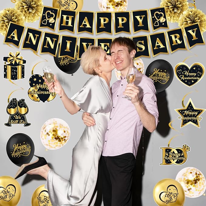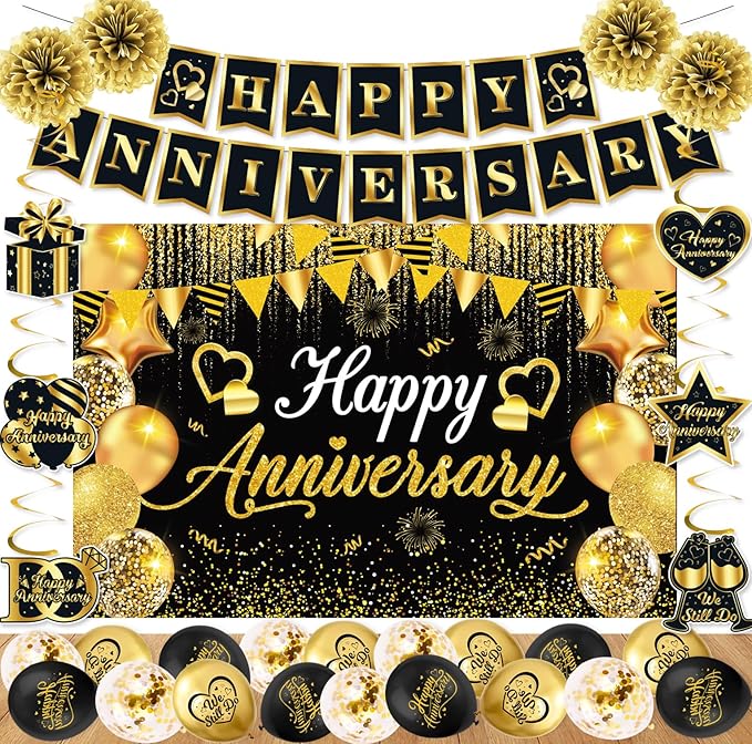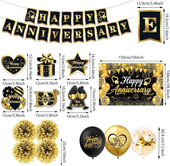 • Quality Materials: Crafted from high-quality polyester, this backdrop is built to last, ensuring vibrant colors and soft texture even after multiple uses and folds; Happy Anniversary Banner is made of quality card. 18PCs Happy Anniversary Balloons(6Pcs black balloons, 6Pcs gold balloons and 6Pcs sequin balloons) are made of high grade latex material. Hanging swirls come with ropes and straps for easy fixing and mounting;