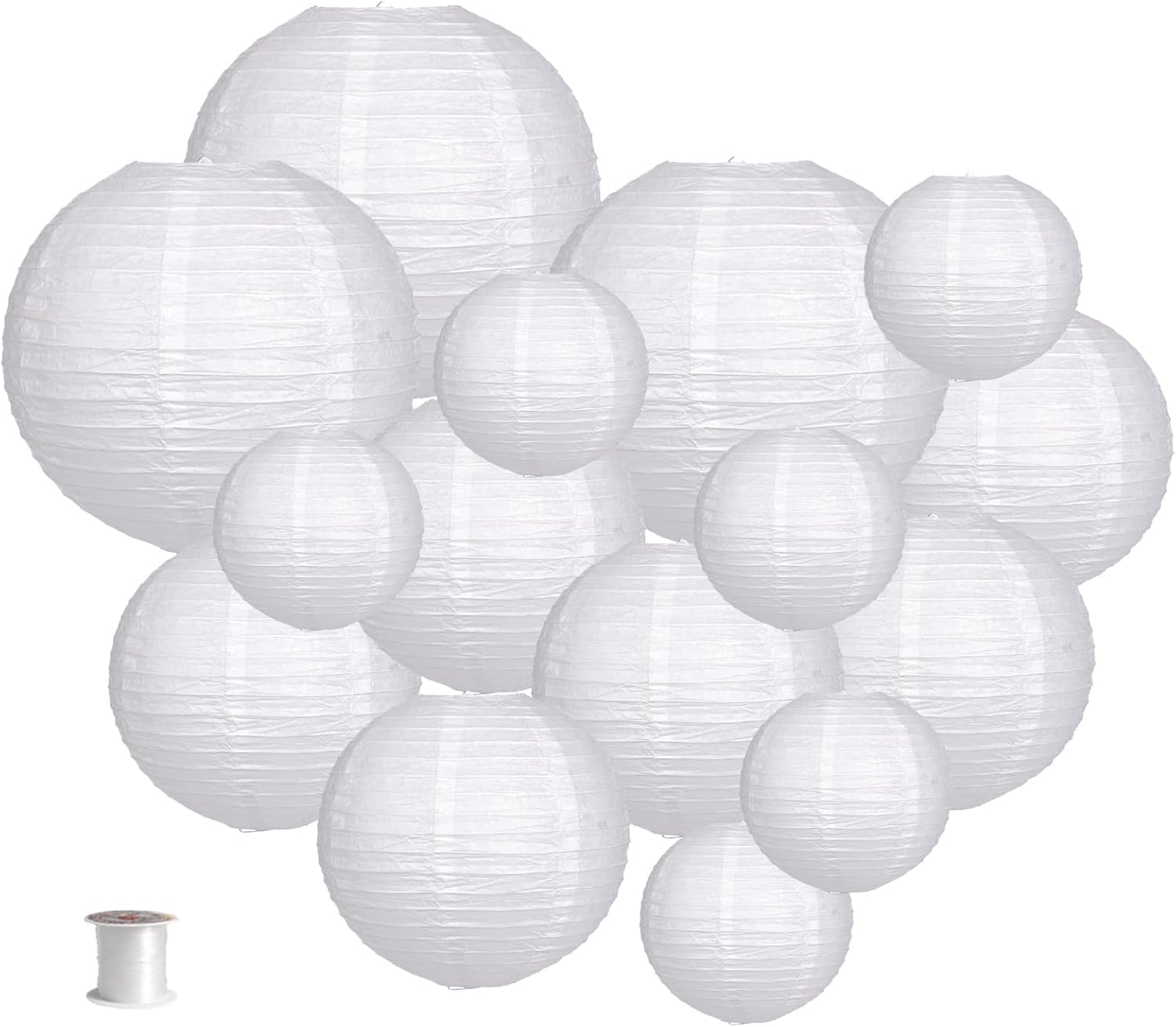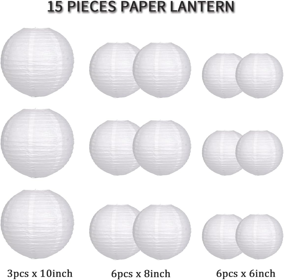• PAPER LANTERN SETS CONTENTS- White paper lantern sets come with 15 pcs paper lanterns to hang in your party, they size include 10 inch 3 pcs, 8 inch 6 pcs and 6 inch 6 pcs. These different sizes and white lanterns give you a variety of backgrounds for a variety of themed weddings and parties.