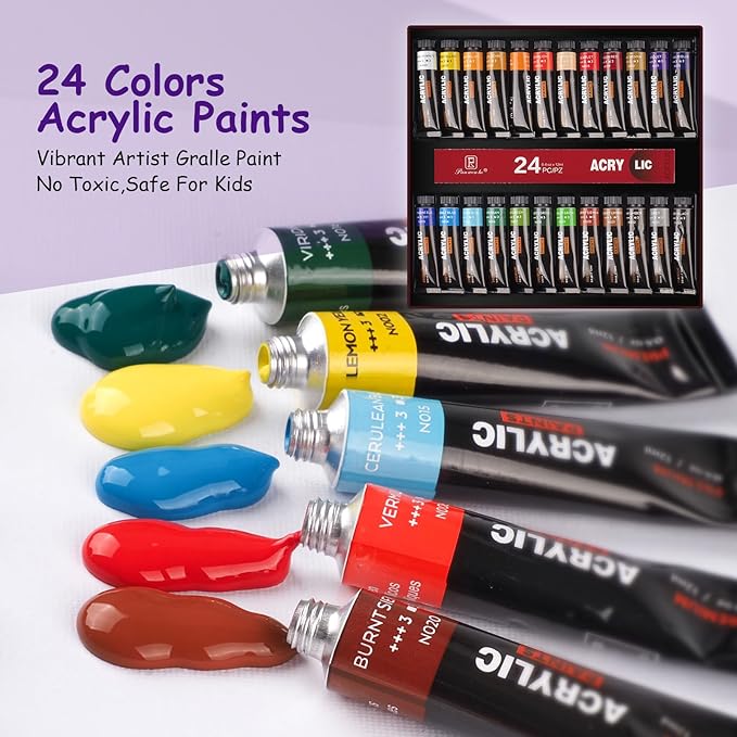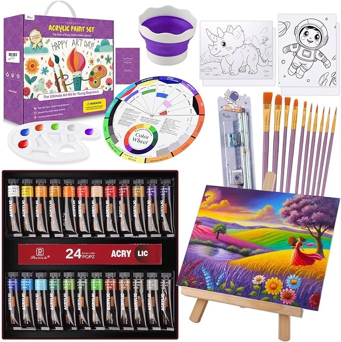 • 【High-Quality Painting Supplies for Kids Ages 4-8 & 8-12】 Our 24 rich acrylic paints are water-based and non-toxic, providing excellent coverage on canvas and other surfaces. The set also includes 10 assorted brushes designed for various painting techniques. Perfect for school art projects, drawing exercises, and creative activities at home.