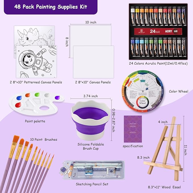 • 【Comprehensive Beginner’s Painting Kit for Kids Ages 4-8 & 8-12】 This complete art set is perfect for young artists and beginners. It includes an 8.2 x 11.2 in wooden easel, 24 vibrant, non-toxic acrylic paints, 10 brushes, and 4 canvases (2 blank, 2 pre-printed). Whether it’s Christmas, Easter, or a birthday, this painting kit for kids ages 4-12 is an ideal gift to start exploring their creativity.