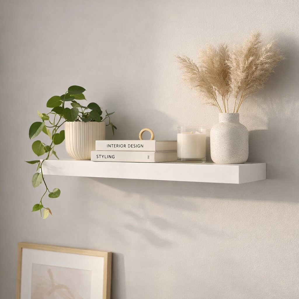 Enhance your interior design with this 24-inch white floating shelf, which offers a sleek and modern way to showcase photos, books, and cherished mementos. Featuring a hidden mounting system for a clean look, this sturdy unit supports up to 17 lbs while remaining incredibly easy to clean with a quick wipe. This versatile storage solution is backed by a one-year limited warranty, making it a reliable and stylish upgrade for any room in your home.